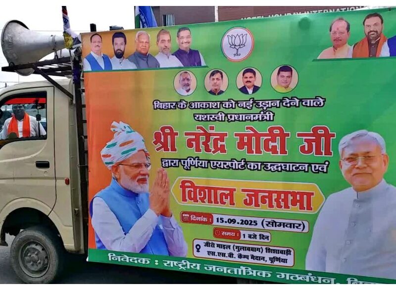 Posted inCity Local NDA ने पूर्णिया में चुनावी अभियान शुरू किया, मोदी 15 सितंबर को करेंगे एयरपोर्ट का उद्घाटन और जनसभा को संबोधित। by Lov SinghSeptember 8, 2025