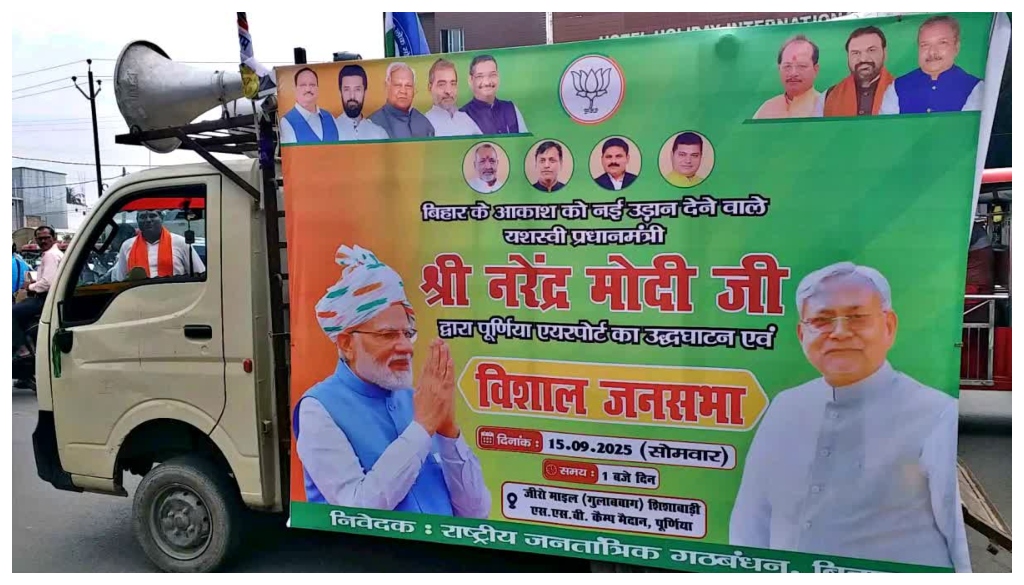 NDA ने पूर्णिया में चुनावी अभियान शुरू किया, मोदी 15 सितंबर को करेंगे एयरपोर्ट का उद्घाटन और जनसभा को संबोधित।