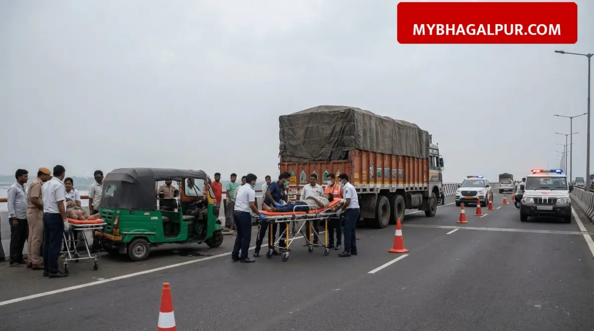 भागलपुर के विक्रमशिला सेतु पर शुक्रवार की रात एक दर्दनाक हादसा हुआ, जिसमें एक तेज रफ्तार अनियंत्रित ट्रक ने टोटो को पीछे से टक्कर मार दी। इस दुर्घटना में टोटो पर सवार चार यात्री गंभीर रूप से घायल हो गए हैं। जानकारी के अनुसार टोटो रेलवे स्टेशन से नवगछिया की ओर जा रहा था, तभी पीछे से आ रहे ट्रक ने उसे जोरदार टक्कर मारी। टक्कर इतनी भीषण थी कि टोटो का संतुलन बिगड़ गया और वह पुल के डिवाइडर से जा टकराया।